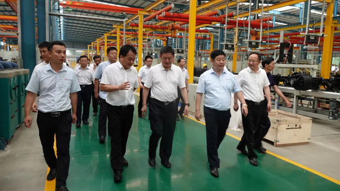 在一线生产车间,一行人在集团董事长李广建的全程陪同下对正阳车桥的装配线、流水作业线、主要高端智能加工设备、产品的加工及工艺现场进行了详细了解观摩。